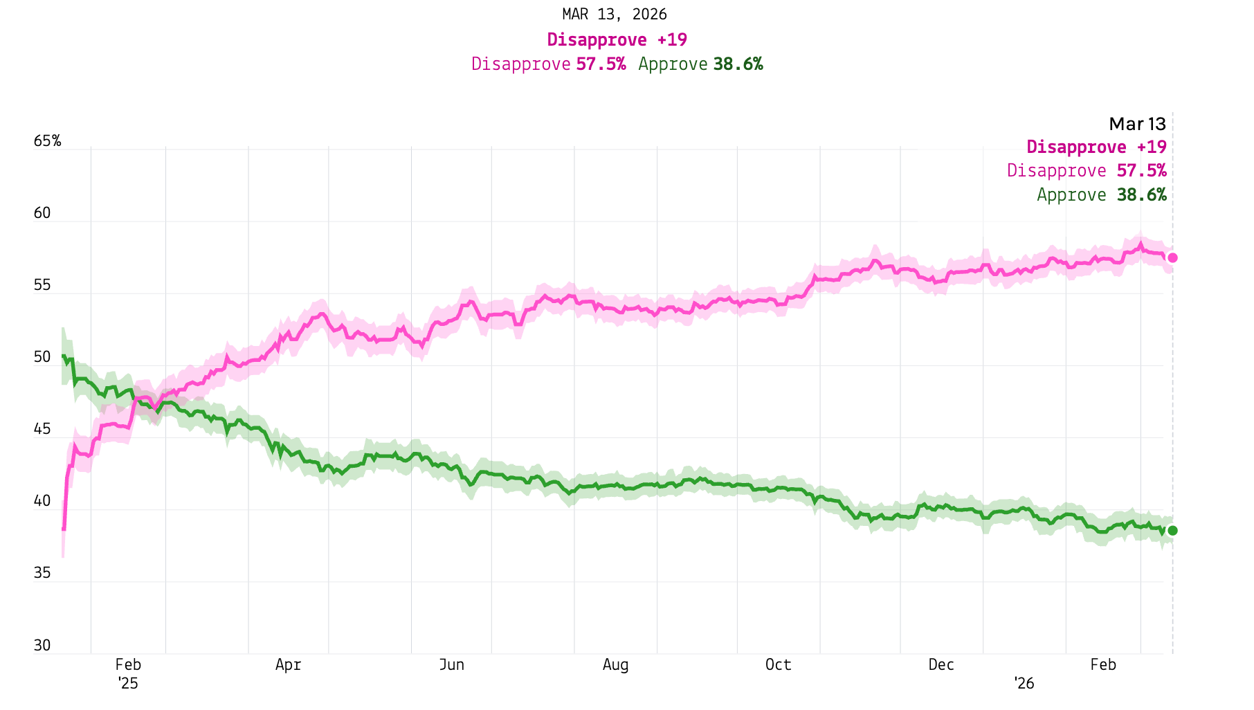 President Trump’s approval rating (38.6%) declined within the margin of error from 38.7% in the week ending March 13, 2026. His disapproval rating also “fell” from 57.8% to 57.5, taking him just off an all-time-high net disapproval rating (now -19).