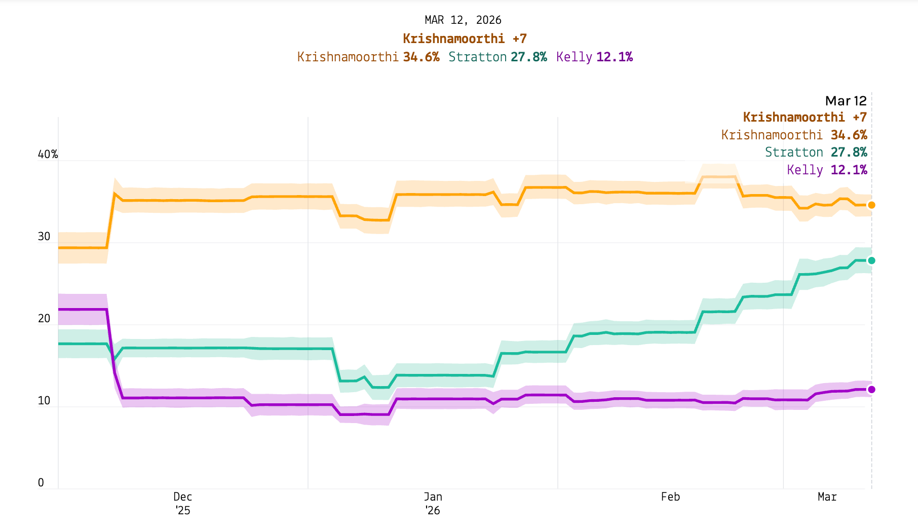 This week, 50+1 launched a polling average for the upcoming Democratic primary for U.S. Senator from Illinois (the seat currently held by retiring Sen. Dick Durbin). According to the polls, the race is most likely to be won by Raja Krishnamoorthi, the current U.S. Rep. from Illinois’ Eight Congressional District; Juliana Stratton, the state’s current Lieutenant Governor; or Robin Kelly, the Rep. from IL-02.