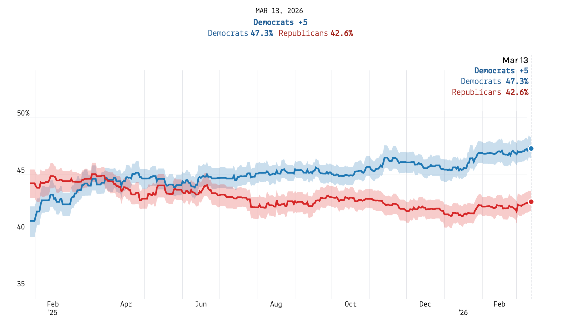 Democrats have held their lead on the 2026 U.S. House generic ballot at +4.7 over the last week, rounding to 47% of the vote for Democrats versus 42% for the Republicans.