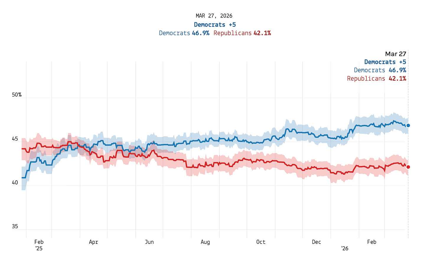 Democrats have held their lead on the 2026 U.S. House generic ballot at +5 (after rounding) over the last week, with 47 percent of registered voters saying they’ll cast their ballot for Democrats this fall versus 42 percent for the Republicans.
