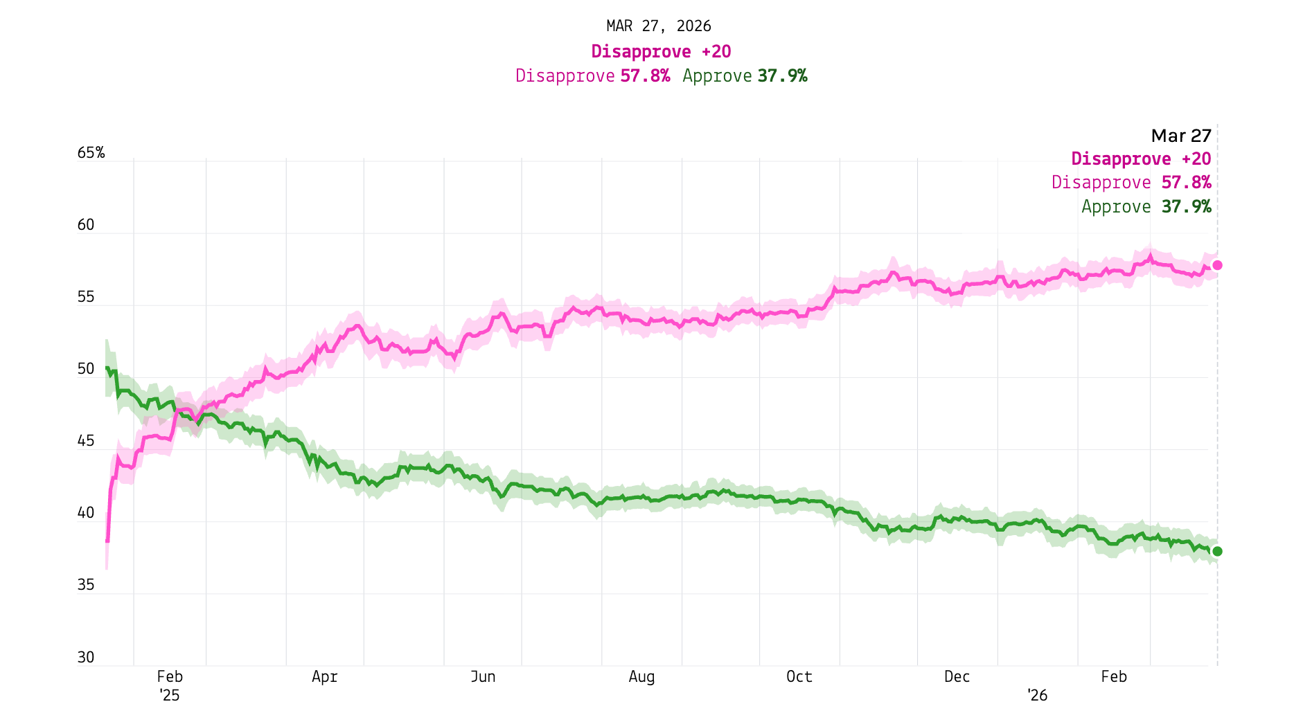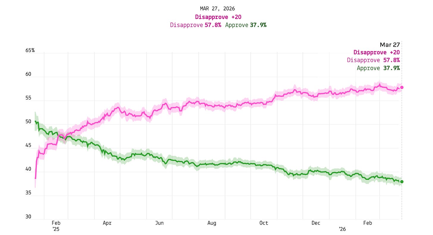 Another week, another new low in President Trump’s approval rating. POTUS sagged to 37.9 percent this week, the first time in his second term that his approval percentage started with the number 37. His disapproval rating also rose slightly from 57.2 to 57.8 percent. The net rating of -19.9 is also a new low.