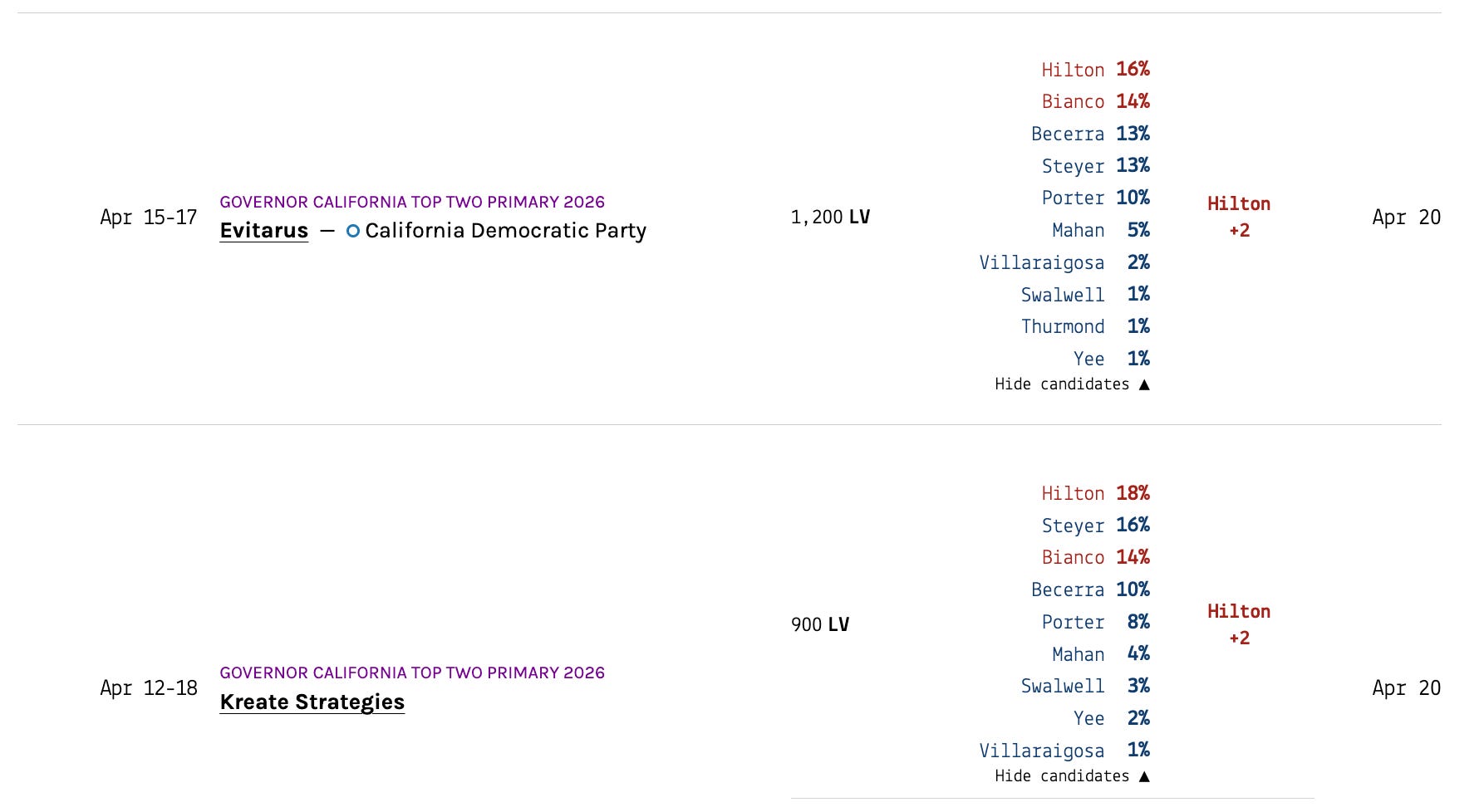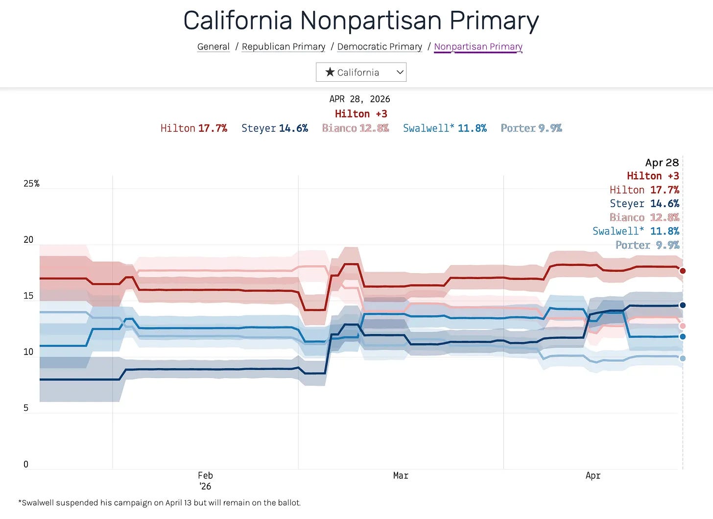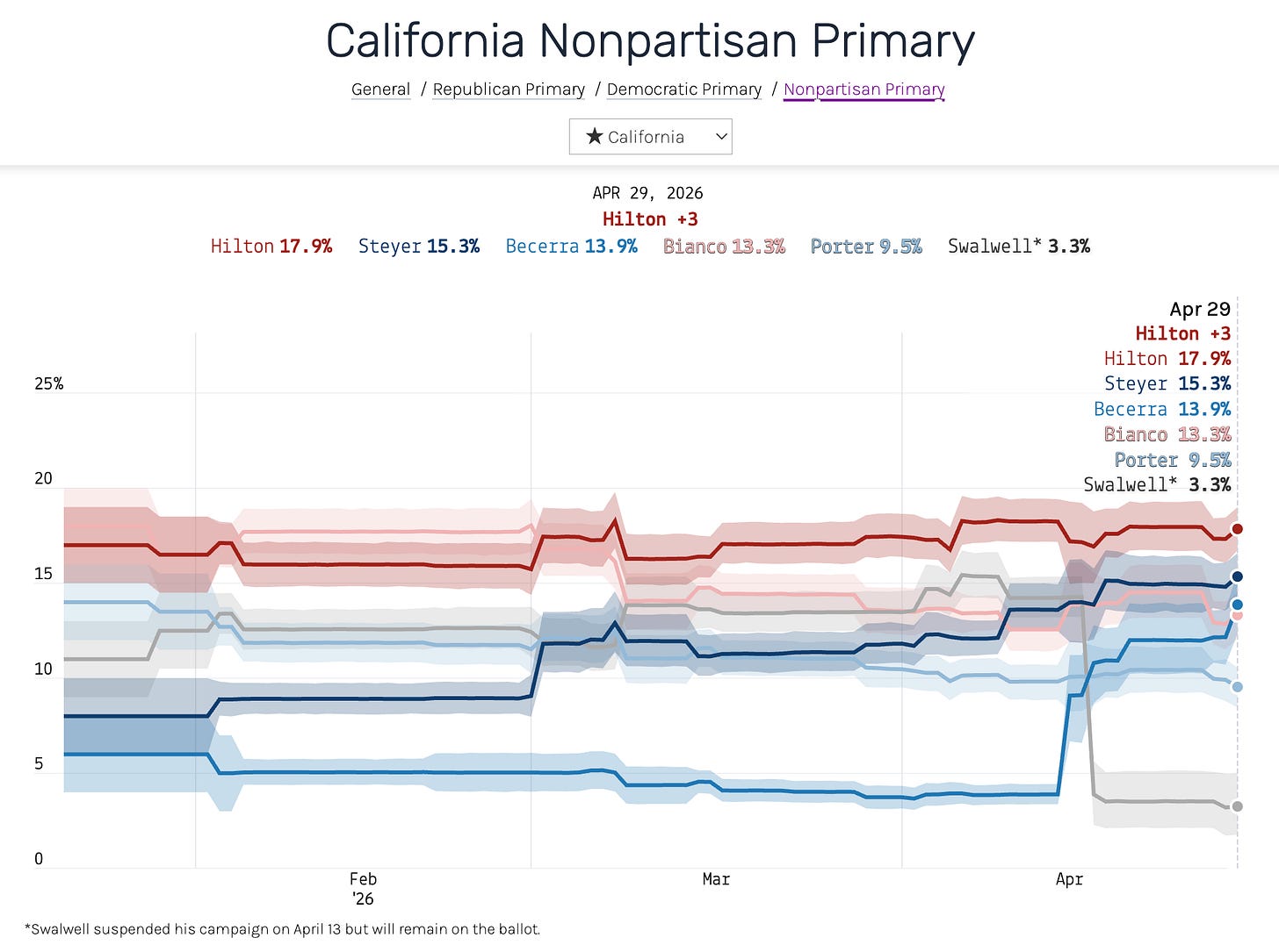 I’ve been thinking about this recently in the context of our average of polls for the upcoming California gubernatorial primary. Our polling average, as it appeared on April 28, 2026, appears below: