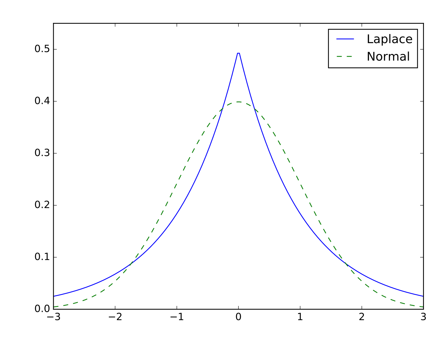 average[today] = average[yesterday] + step[today]Where step[today] is a number that is drawn from a statistical distribution called a Laplace distribution that looks like this: